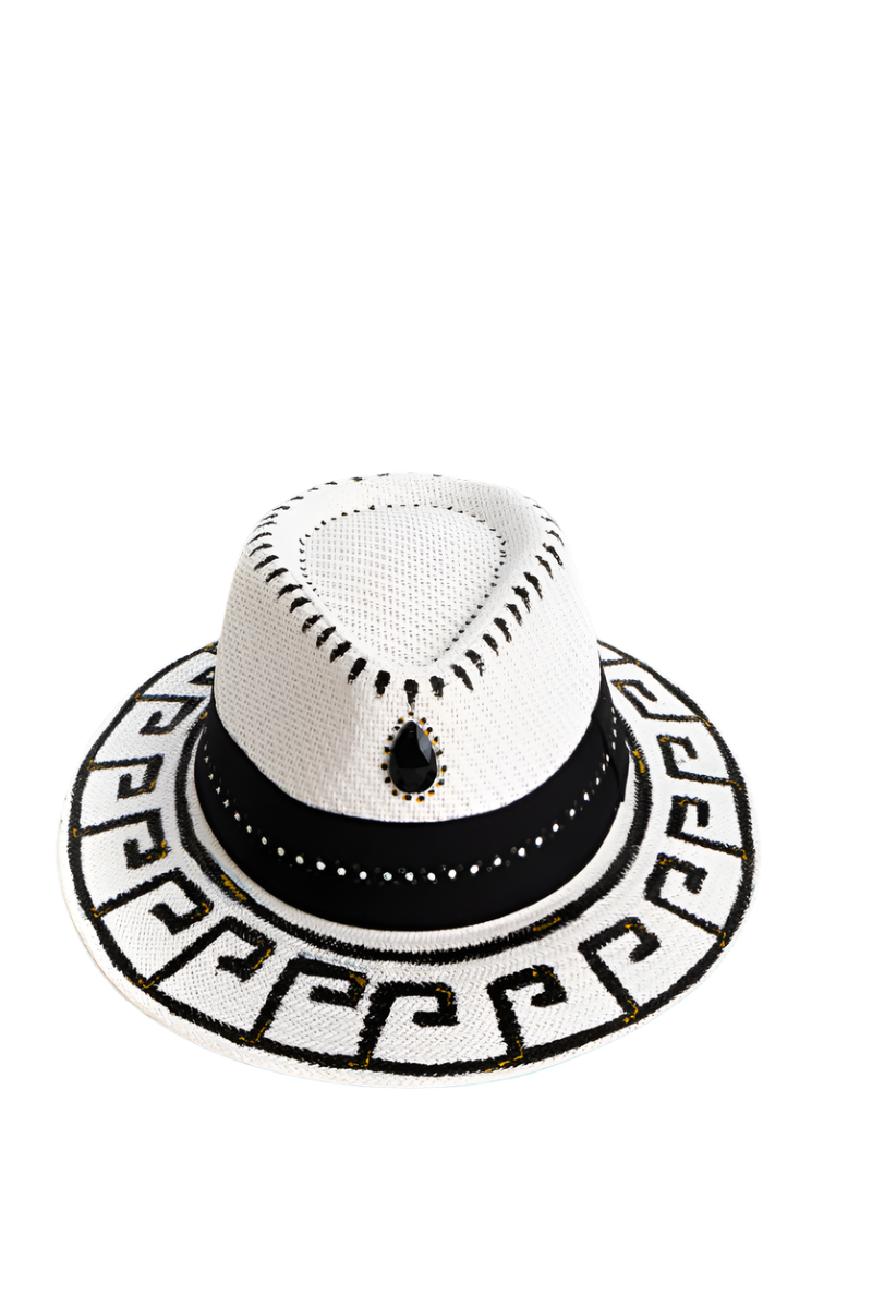 This stunning white and black hand painted Fedora style hat from Sorena adds a little fun to your beach look! A white hat with black hand painted Greek design and black imitation gemstone. The hats are exclusively designed in Greece.