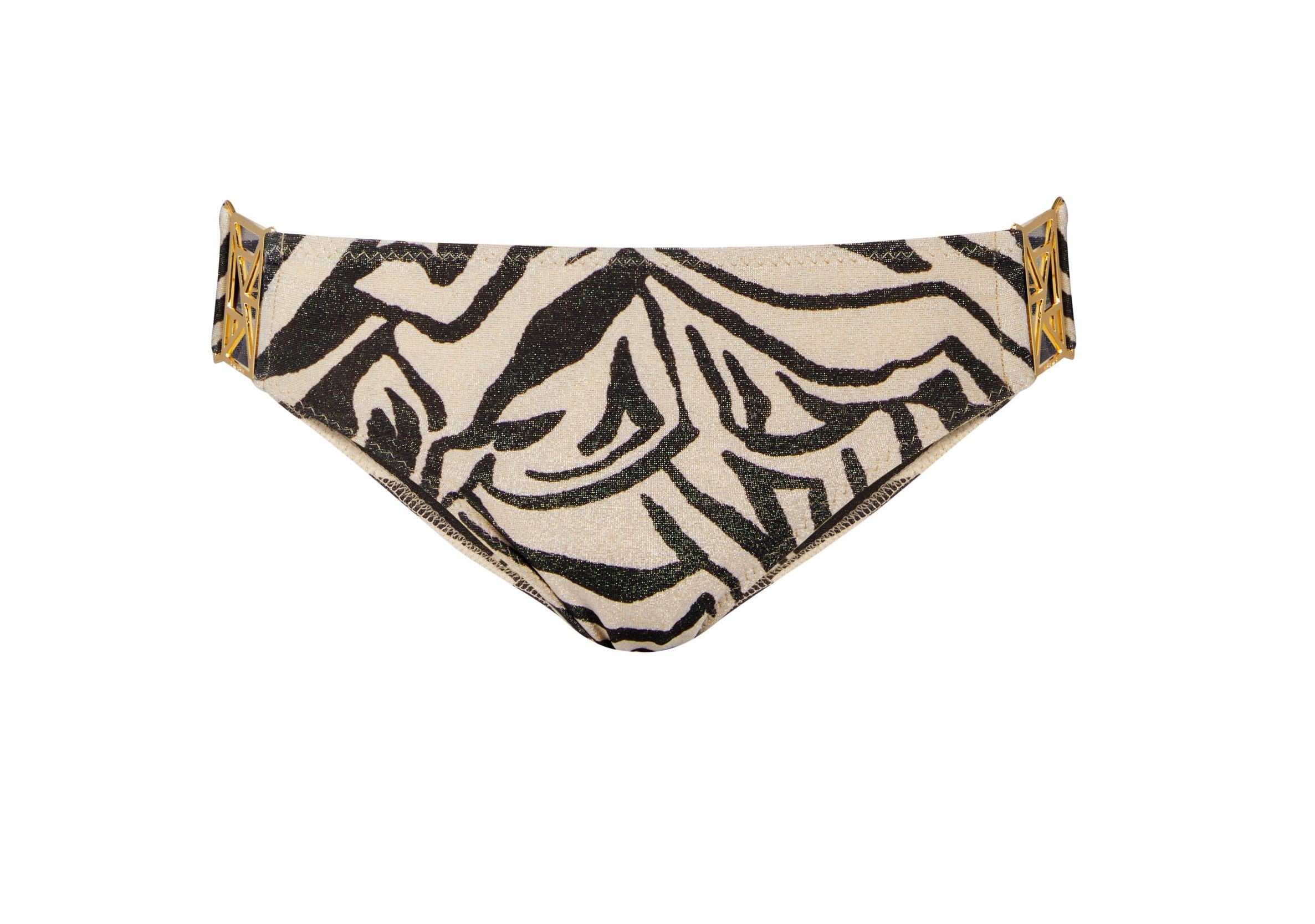 A classic bikini bottom with luxury fixed gold side detail in a shimmering animal print sustainable fabric. Giving slightly more coverage than the Kate bikini bottoms. Pair these with the Michele halter-neck style bikini top or the Kate bandeau bikini top in Savannah Shimmer.