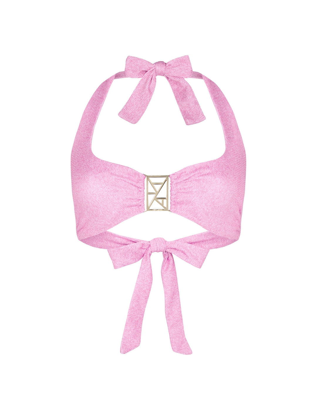 A stunning halter-neck style bikini top that combines support with a touch of glamour! Adorned with our statement bespoke gold anagram at the centre the Michele Bikini exudes luxury. Designed for versatility, it comes with adjustable side and neck straps and underwire in the cup for extra support.