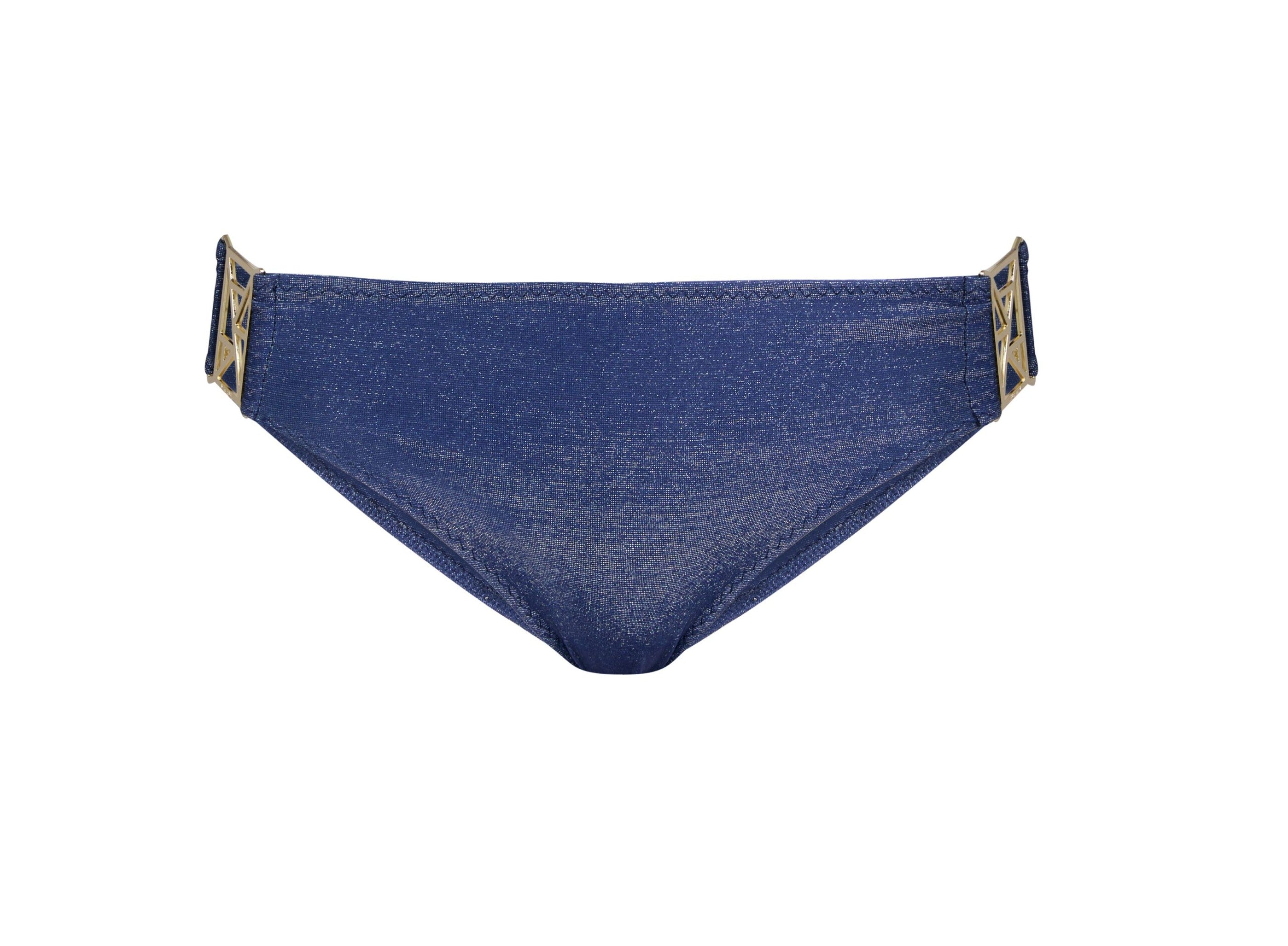 A classic bikini bottom with luxury fixed gold side detail. Giving slightly more coverage than the Kate bikini bottoms. Featured in a beautiful navy blue fabric with a gentle shimmer that glistens in the sun.