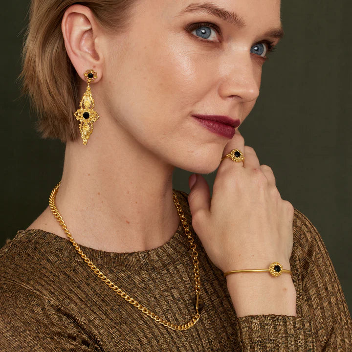 These stud earrings feature a vintage lace design adorned with black onyx gemstones, creating a bold and distinctive statement accessory.